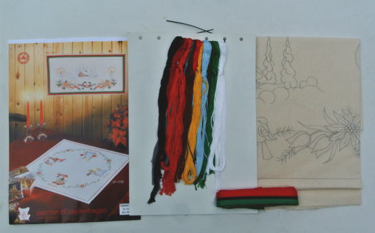 JH005J Permin Bonad 刺繍壁掛け 刺繍キット Bonadとよばれるスウェーデンらしい雪景色の絵柄の 刺繍 壁掛け DMCの12色の刺繍糸、aggskalと呼ばれる繊維のはいった綿布 チャート まわるを飾る綿テープ ヴィンテージの未使用品です 完成サイズ 69x38p Price 3600YEN(送料込み)
