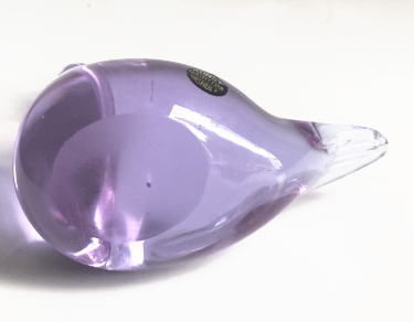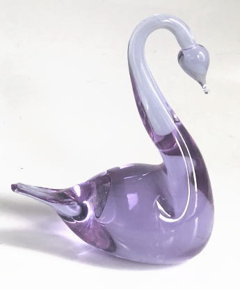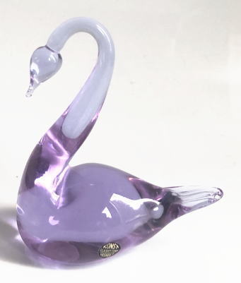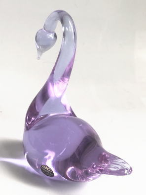 白鳥のフィギュリン 自然光でみると頭と尾の部分がうすいバイオレット 体の部分がパープル 光によって色のニュアンスが変わります。スウェーデンのスモーランド地方にあるガラス工房Urshult製、、窓辺にかざってあげるときれいです、、、