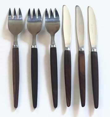 ディナーサイズよりやや小さめのサイズの軽食用のチークハンドルのカトラリーのセットです、、、