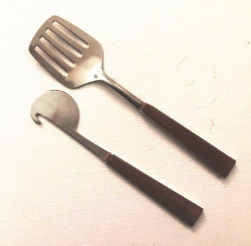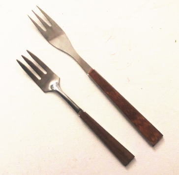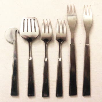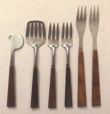 スウェーデン STAKOのカトラリー6点セット ハンドル部分にチークがはめ込まれたきれいなデザインです、、、 右からフォーク2種 ニシン用サーバー 一番左のものは使用法が不明です