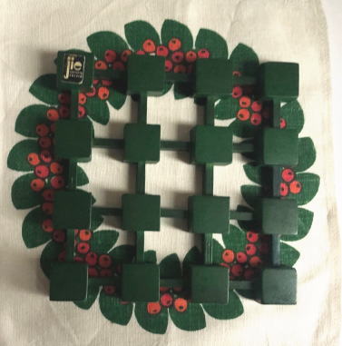 Jie Gantofta製 組み木のグリーンのトリベット(鍋しき)です。リンゴンベリーがハンドプリントされた麻のドイリー付きです jie gantoftaのスティッカ―が残っています。