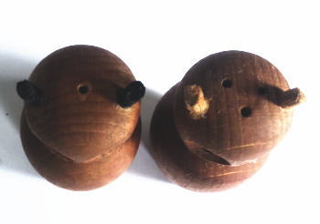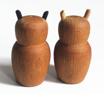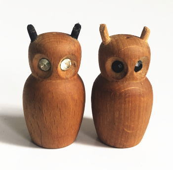 木製のかわいらしいクリアの目と黒の目ふくろう(みみずく)のスパイスシェイカーセットです。、、