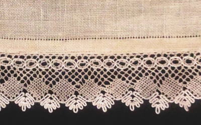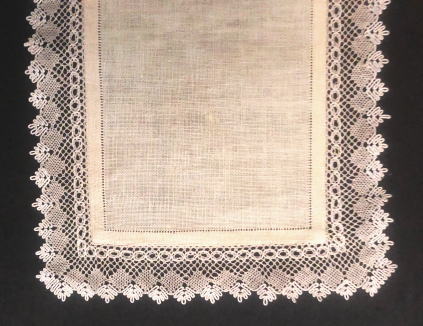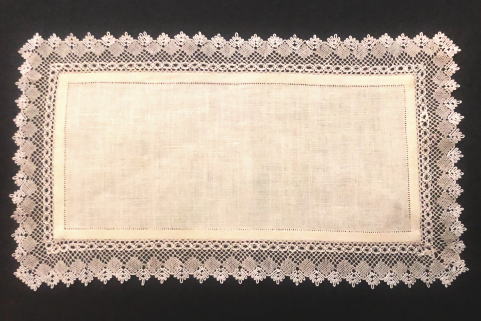 麻布にボビンレースをあしらったテーブルセンター、たくさんの時間と手間をかけて美しく編まれたボビンレースとホールソム刺繍が素敵な作品です。テーブルセンターとして小ぶりのサイズです オフホワイトの色合いです