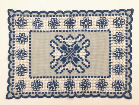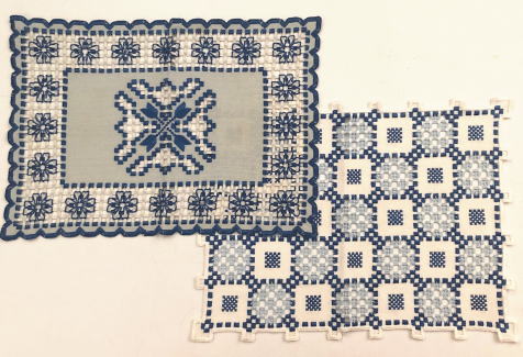 あまりみかけることのない色合い、デザインのハダンガー刺繍のテーブルセンター2点 ブルー系の布 糸を使って丁寧な仕事が施されています*ノルウェイが起源の北欧刺繍 Hardanger、日本ではハーダンガーと表記されることが多いようですがハダンガーのほうがスウェーデン語に近い発音です、、
