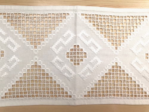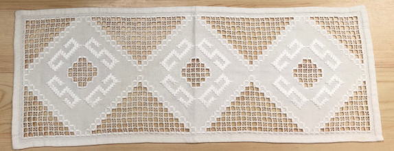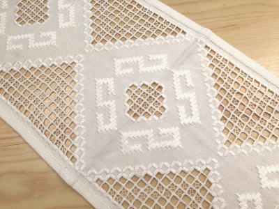 白の布に白糸で刺繍されたハダンガー刺繍のテーブルセンター たくさんの時間を費やした丁寧な手仕事の作品です。*ノルウェイが起源の北欧刺繍 Hardanger、日本ではハーダンガーと表記されることが多いようですがハダンガーのほうがスウェーデン語に近い発音です、、