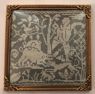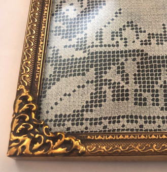 はじめに糸をむすんでネットを編み、そして刺繍でしあげていくフィレレース、大変な時間、手間を必要とします、動物やとり 草花や人があまれた1900年代中期ごろの作品、真鍮製の額で額装されています。ガラスに湾曲加工がされているので額の中に飾った作品がきれいに見えます。