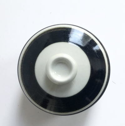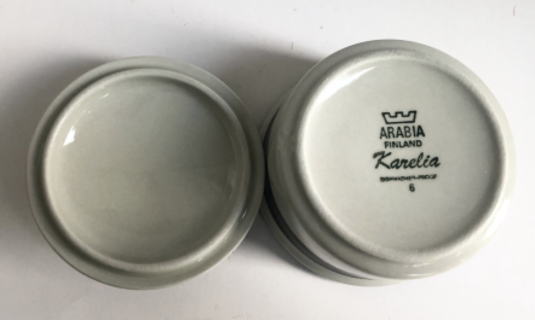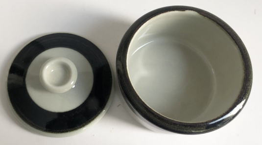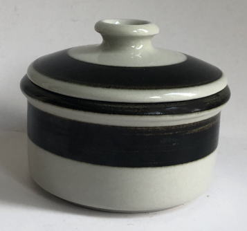 ハンドペイントされたダークブラウンのライン ARABIA Kareliaシリーズのシュガーポットです。シンプルなデザインなので他のカップアンドソーサーなどとも合わせやすそうです 、、、