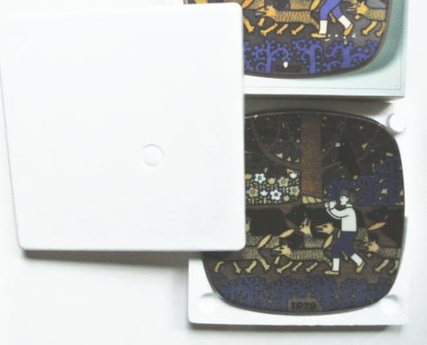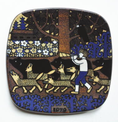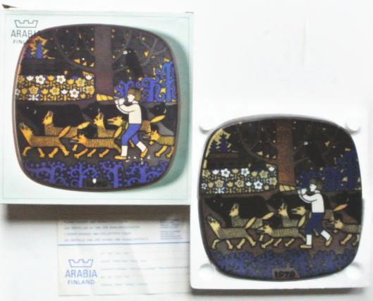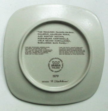 1976年から1999年まで製造された Raija Uosikkinenデザインのイヤープレート、KALEVALAシリーズ、裏側にストーリーがフィンランド語 スウェ-デン語 英語でプリントされています。こちらはシリーズ4番目の1979年のプレートです