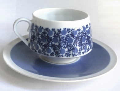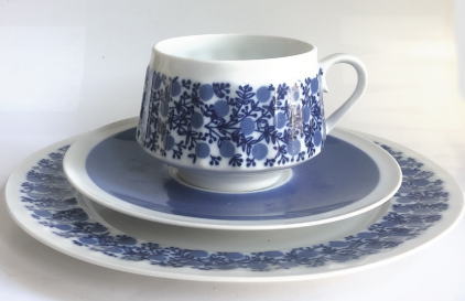 ,ARABIA Doriaのトリオセット カップ安堵ソーサーとケーキプレート ブルーの実がデザインされた小ぶりなサイズ ウェイブのあるきれいなフォルムで上品なコーヒーカップ デザインはライヤ・ウオシッキネンです。
