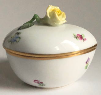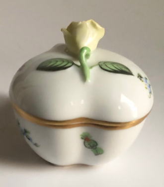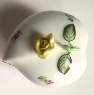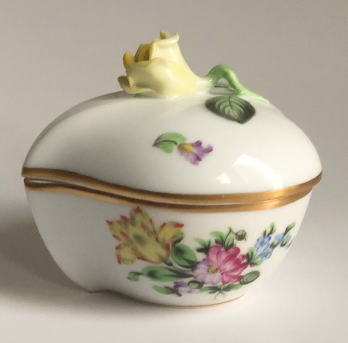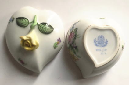 世界の名窯 ハンガリーのHerendヘレンド窯のチューリップの花束シリーズのハート型小物入れです、ふたにはフィニアル(つまみ)の黄バラ 丁寧に手描きされた絵柄が素晴らしいです、