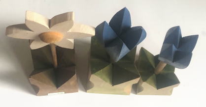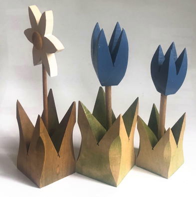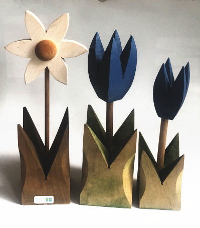 木製のマーガレットと青いチューリップ3点の置物
