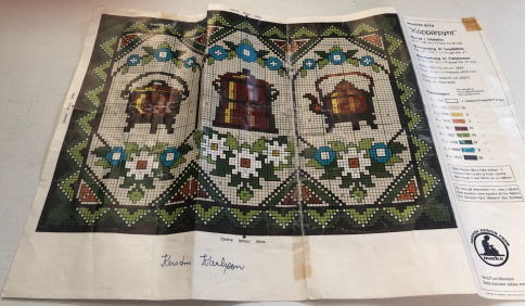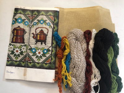 MARKS社のトゥヴィスト刺繍キット、昔のキッチンで使われたコパ―製の鍋やケトルのデザインです Tvist刺繍用生地、9色のウール糸、、カラーのチャート のキットです。