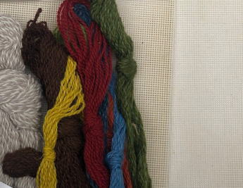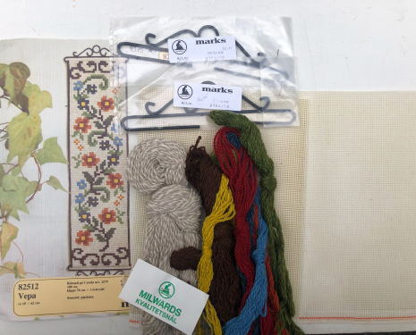 刺繍用生地、ウール糸、、カラーのチャート 刺繍針 メタル製のハンガー2点付きのキットです。