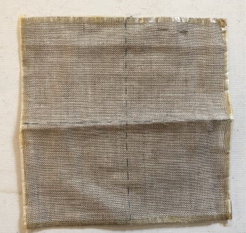 クララ・ウェ―バ―のヴィンテージ品のキット リンゴの花のようなピンクの花のデザイン 麻地、刺繍糸11色、 針チャートのキットです。*麻布のまわりにほつれ止めのテープがはられ中心線のステッチがみられます