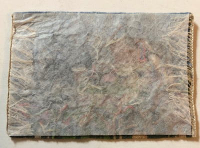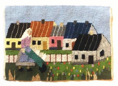 北欧の家並みと庭仕事をする人がきれいな色合い織られた作品です。不織布の裏地がついています