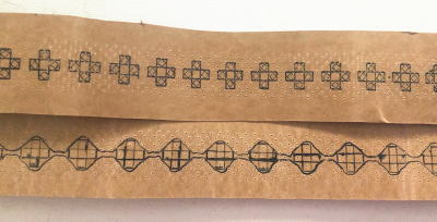 スウェーデンレース協会,のボビンレース図案3種とその他図案7種 ボビンレースを編む際に、ピンをさして使う厚紙の図案です、レース協会の図案は使う糸、ボビンの数が記載されています、下から5番目の図案は15ペア(30本のボビン使用)その他の図案には特に記載されていません
