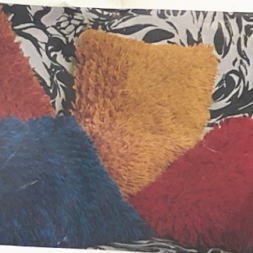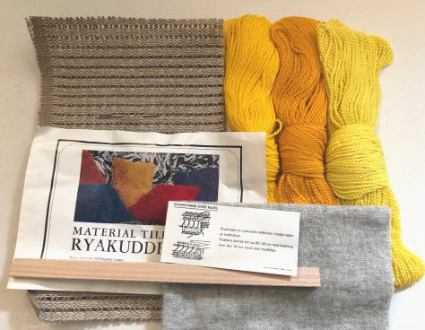 リイヤのクッションのキット 3色の黄色のラデーション または色を混ぜております。Rya Garnとよばれるリイヤ用のウール100%の糸、説明書、針 リイヤ用布 リイヤ用棒 クッションの裏地 のキットです
