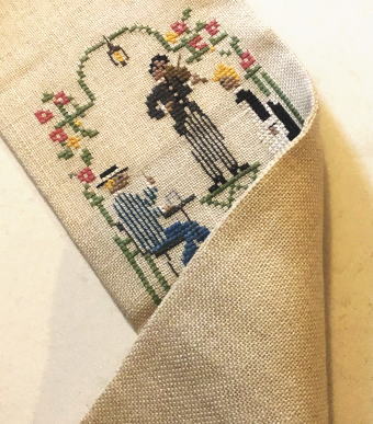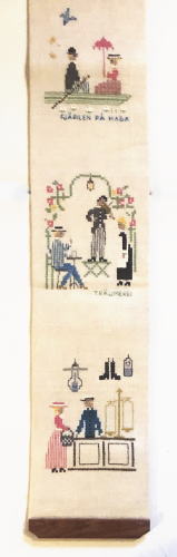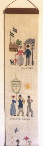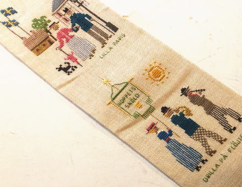 昔のスウェ―デン風景をデザインしたクロスステッチ刺繍タペストリーです。麻布に刺繍され、麻によく合う木製のベルプルハンガーがついています