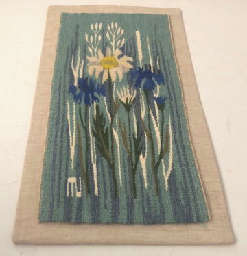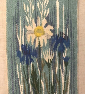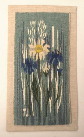 たくさんの時間を費やして織りあげられたフレミッシュ織 ヤグルマギク マーガレットなどがきれいに織りあげられた作品です 壁掛けとして仕上げられています。