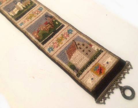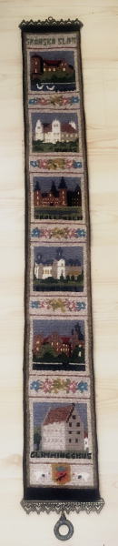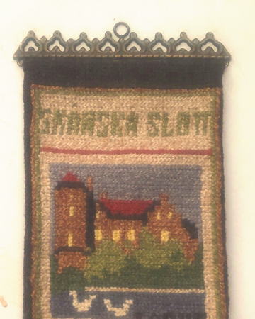 スウェ―デン南部スコーネ地方にあるお城がモティ−フになったロングサイズのトゥヴィスト刺繍のタペストリーです。、ドイツの古城のような豪華なお城ではなく、これがお城?と思うような素朴な北欧らしいところが多いのです。真鍮製のベルプル金具がついています。
