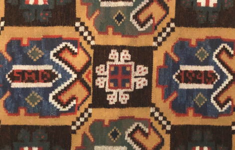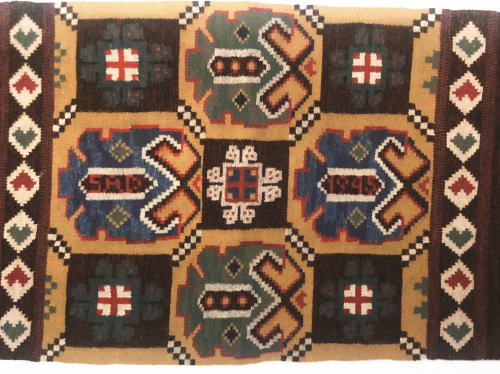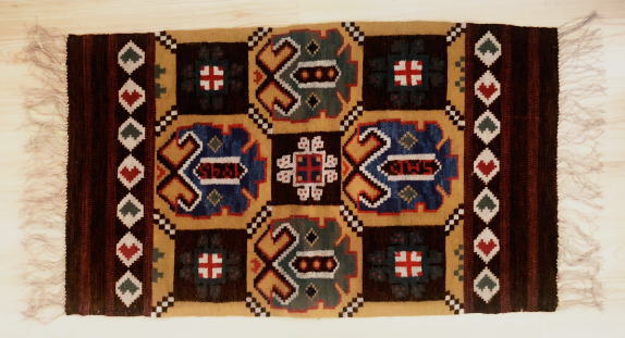 スウェーデン、織物などのすばらしいテキスタイルが多数産出されたスコーネ地方で織られたRolakan織りのマット、1945年の作品 美しい色合い 絵柄の作品です。