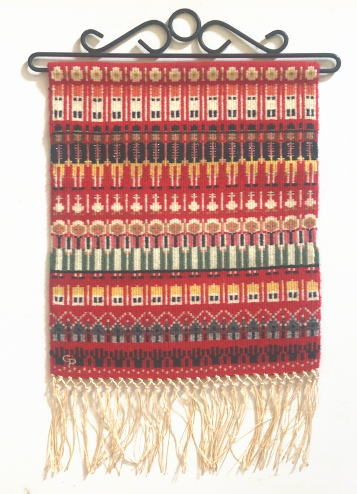 小さな連続模様が印象的なBUNDEN ROSENGANG織 教会 民族衣装を着た男性 がちょう 民族衣装を着た女性 家 PILの木が織られたタペストリーです メタル製のタペストリーハンガーがついています