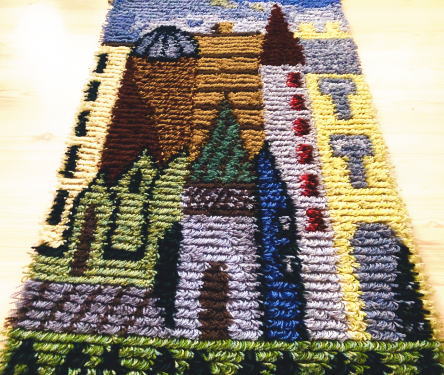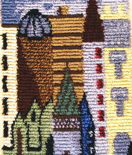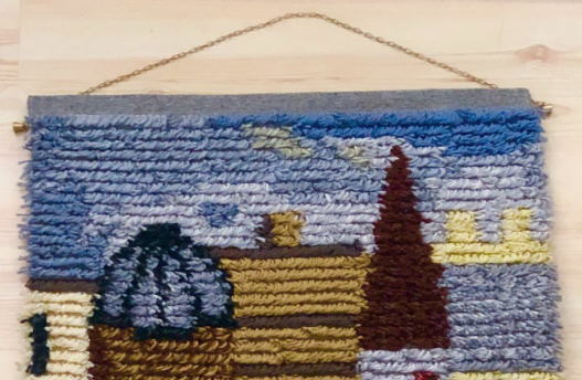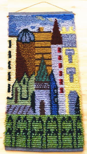 建物がきれいな色合いで織られています。真鍮製のハンガーがついています。