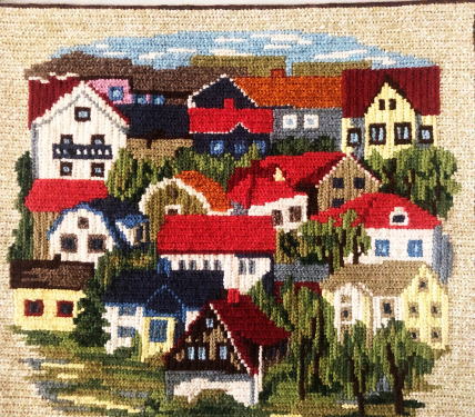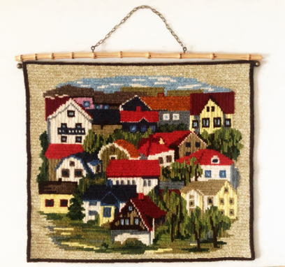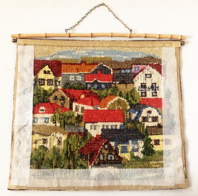 たくさんの時間を費やして刺繍されたトゥヴィスト刺繍、、きれいな色合いで刺繍された家並みが素敵な作品です、風合いの良い竹製のハンガーがついています