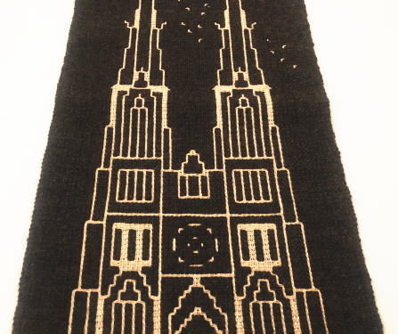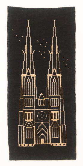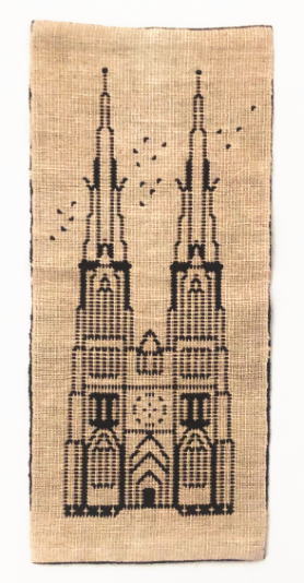 | スウェーデン、BOHUSのフィン織り、2重織りは紀元前200年のむかしから、北欧では中世から行われた歴史の長い織技法です。黒,茶、紺などの濃い色と麻の薄い色の2色で表現されます。今回入荷した作品は、きれいに織りあげられた、スウェ―デン ストックホルムの北に位置するウプサラのウプサラ大聖堂がモティーフのタペストリーです、上部にタペストリーハンガーやバーなどをとりつけて飾ります |