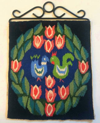 チューリップと葉のリースと2羽の小鳥のモティ−フのフレミッシュ織 タペストリーとして仕上げられています。