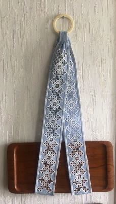 ブルーに白糸 丁寧なハダンガ―刺繍が施されたトレイハンガー トレイを収納するために使うものですが、ドライフラワーなどをかけたりアイディアしだいで素敵にお使いください。丸型トレイ、四角型トレイ両方につかえます。キッチンのアクセントにもなりますね、、、*かけるリングの部分はプラスティッく製です リングから取り外せるようにボタンがついています。