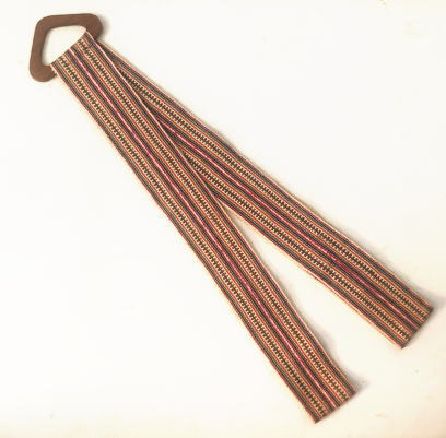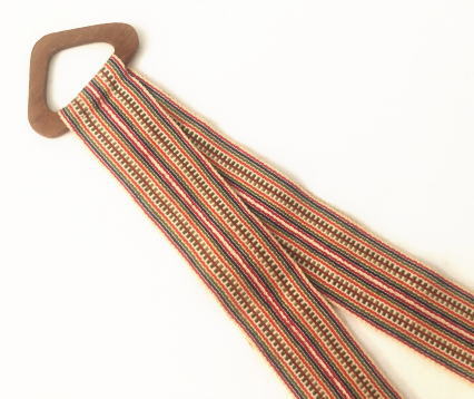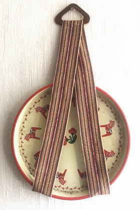 白 赤 青 緑の糸で織られたリボンを縫い合わせてつくられたトレイハンガー。掛ける部分はチーク製 トレイをかけたりして使うものですがドライフラワーなどをかけたりアイディアしだいでいろいろお使いください 丸型トレイ、四角型トレイ両方につかえます。キッチンのアクセントにもなりますね、、、