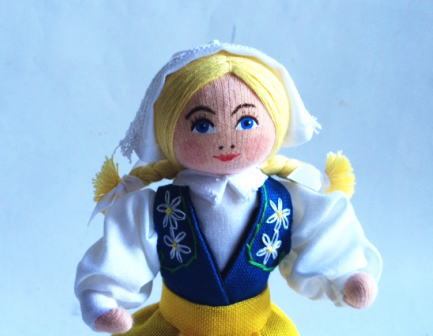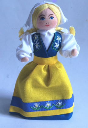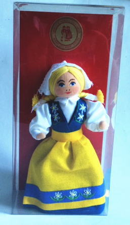 スウェーデン王国の正装 民族衣装を着た女の子 本物の民族衣装と同じ生地、手編みのボビンレースが使われが使われ細部まですべてハンドメイドされています。ボックス入りです