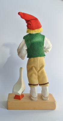 Selma Lagerlofによって執筆された児童文学 Nils Holgerssonニルスのふしぎな旅のニルスとがちょうのモルテン 細部まで丁寧に手作業で作られていてグリーンのベストの内側にChalotte Weibullのタグがついています。 モルテンは木製です 台にはニルスのフルネーム Nils Holgressonが焼きつけられています