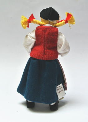 スウエーデン ハランド刺繍で知られるハランド州のSonndrumの民族衣装を着た女の子 Sondrumはハランド州の州都HALMSTADの近くにあるとても小さな町ですのでなぜわざわざこの町の民族衣装がつくられたのか不思議です 髪の毛が長靴下のピッピのように立ち上がった三つ編みです 実際に民族衣装に使われる高品質の布地を使って、刺繍はすべて手刺繍、レースは手編みのボビンレースが使われ細部まで丁寧につくられたお人形です