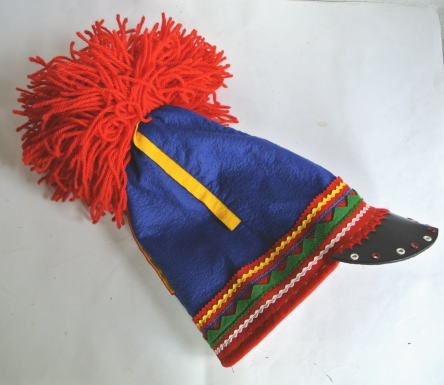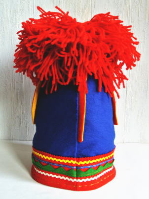 スカンジナビアの北部に居住するサーミ族(サーミ人)の民族衣装の帽子です サーミの旗にも使われているシンボルカラー 青をベースに大きな赤い房 赤や黄色 緑の飾りのついた帽子です