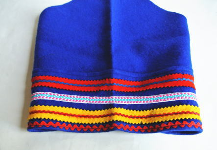 スカンジナビアの北部に居住するサーミ族(サーミ人)の民族衣装の三角巾型の頭飾りです サーミの旗にも使われているシンボルカラー 青をベースに赤や黄色の飾りがついています