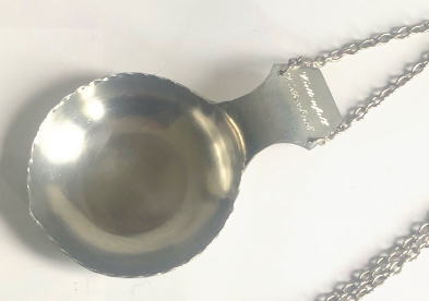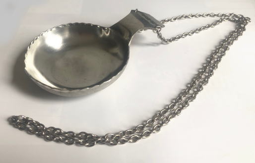 スウェ−デン、ラップランドにすむサ―メ(サーミ)族の伝統、ピュータ製のコーサ、フィンランドではククサとよばれるものです、 ピクニックなど屋外での飲食に使われるもので暖かい飲み物や冷たい飲み物 食器として使われたりもしますハンドメイドされたもので首にかけて使えるように鎖がついています。ハンドルの裏側にhandarbet