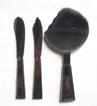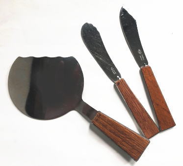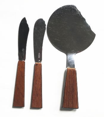スウェーデン STAKOのカトラリーセット ハンドル部分にチークがはめ込まれたきれいなデザインです、、、まるくてかわいらしいサーバー、、、切り分けたりすることもできます、、バターナィフ チーズ(デザート)ナイフの3点セットです サーバーは小さめのサイズですので小ぶりのサイズのお菓子などに使えます