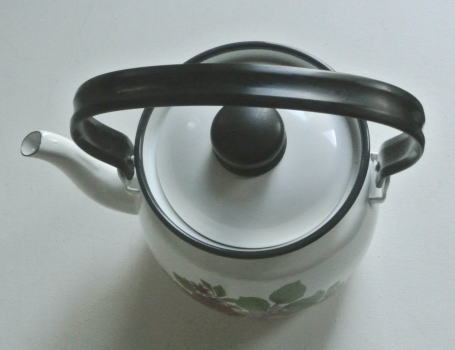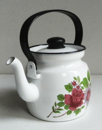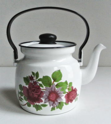まっしろのホーローにパープル系の色合いのお花のデザインされたケトルです。ホーローの状態が良いので普通に使っていただけます