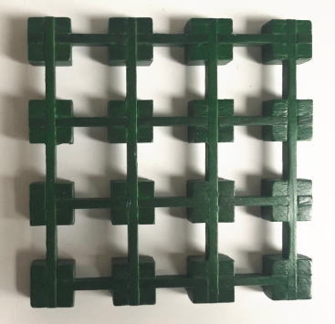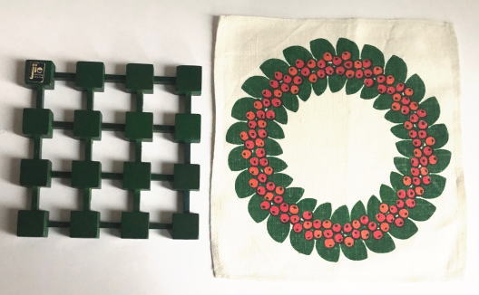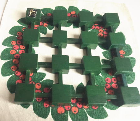 Jie Gantofta製 組み木のグリーンのトリベット(鍋しき)です。リンゴンベリーがハンドプリントされた麻のドイリー付きです jie gantoftaのスティッカ―が残っています。
