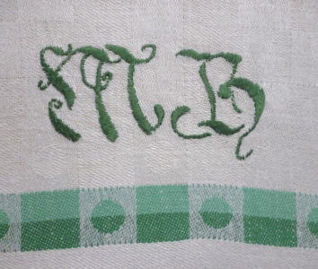 かけておくだけでもキッチンの雰囲気良くなりそうですね、、、、、、リメイクしてクッションカバーやショッピングバッグなど作っても素敵です、、、濃淡のグリーンの織模様、MBのモノグラムが刺繍されています。 |