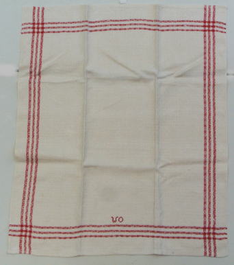 スウェ−デン スコーネ地方で織られた麻クロス しっかりと織られていて厚みがあります 。赤糸でWOの刺繍がはいっています。織リはGasoga織(ガチョウの目の意味)です