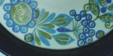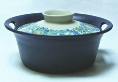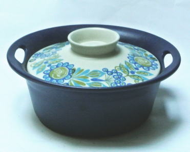 ノルウェイ Figgjoのブルーとグリーンの落ち着きのあるかわいいお花がデザインされた耐熱セラミックのキャセロール、、、、お料理をキッチンからテーブルにもっていってサーブできる素敵なデザインです