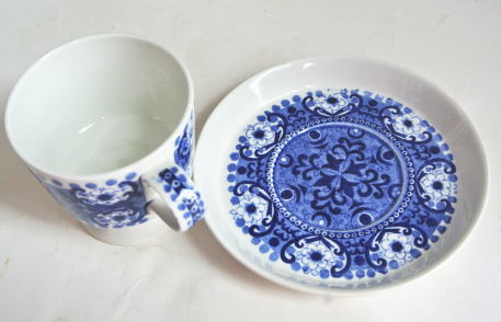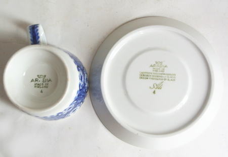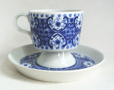| ARABIA ALiのカップアンドソーサー、足つきで小ぶりでかわいらしいフォルムはKaarina Aho、落ち着きのあるブルーの絵柄はRaija Uosikkinenによるデザインです。 |