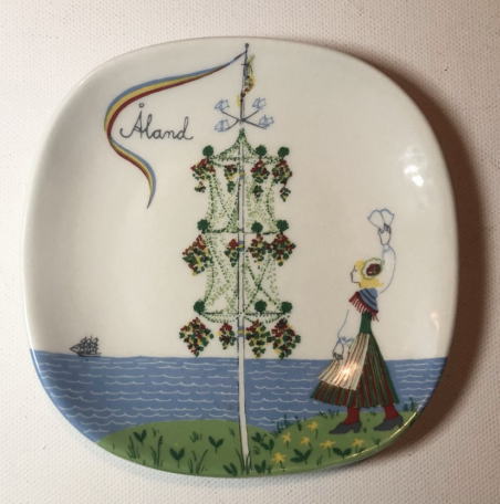 フィンランドの島 Alandオーランド 民族衣装を着た女性が船に向かって手を振る様子 花の飾りなどがデザインされています。