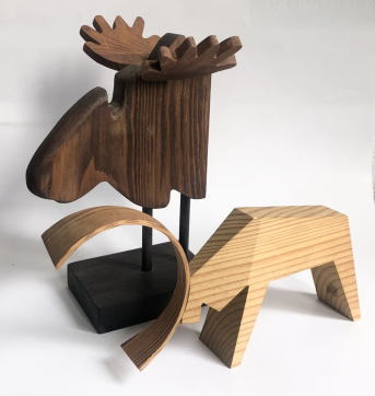 スウェーデン ラップランドででハンドメイドされた木製のトナカイのフィギュリンと南スウェ―デン スコーネ地方Munka Ljungbyの工房でハンドメイドされた木製ヘラジカの置物です。