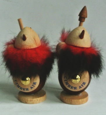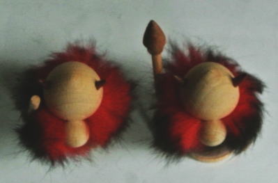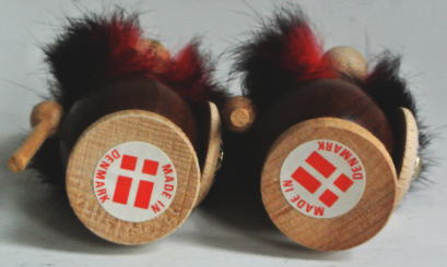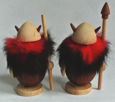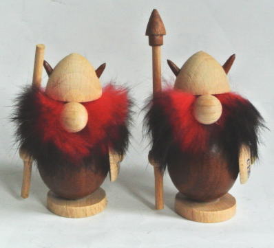 デンマーク製 白木とチークでつくられたヴァイキングの置物 赤いひげはウサギの毛 胴体とヘルメットの角 槍の先はチーク製 *画像左のバイキングは棒だけで槍の先がついていません。Cymber Airのノベルティ品です。