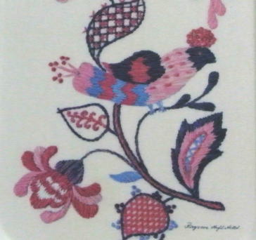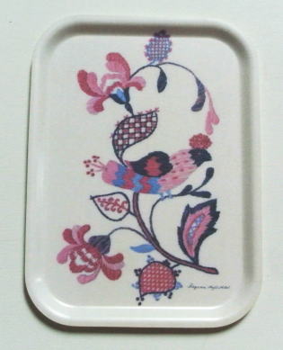 プライウッドに鳥や花のブレーキンゲ刺繍作品の写真をプリントしたものを貼り付けプラスティック加工をしてつくられたトレイです。