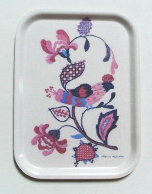 プライウッドに鳥や花のブレーキンゲ刺繍作品の写真をプリントしたものを貼り付けプラスティック加工をしてつくられたトレイです。